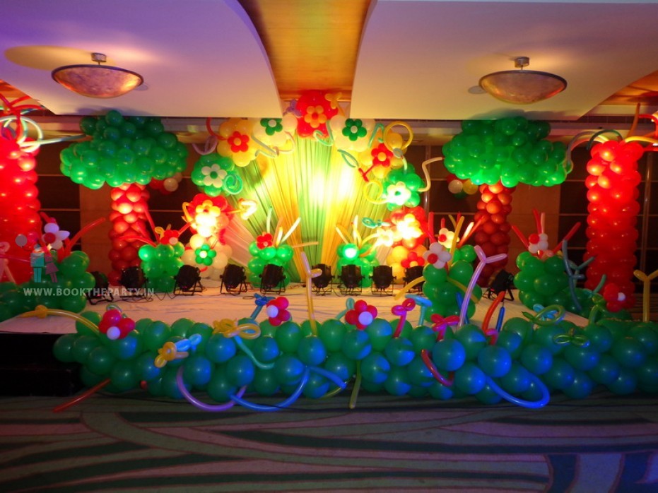 The backdrop is mostly decorated with balloons. The stage fascia is also decorated with balloons to give a grass effect.